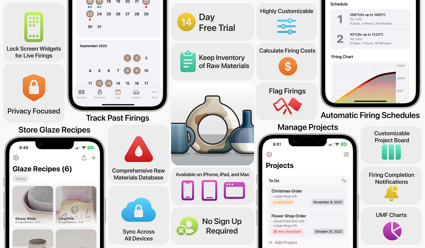 Ceramispace is an all-in-one app for Ceramicists. Store glaze recipes, calculate firing schedules, keep inventory, and so much more.